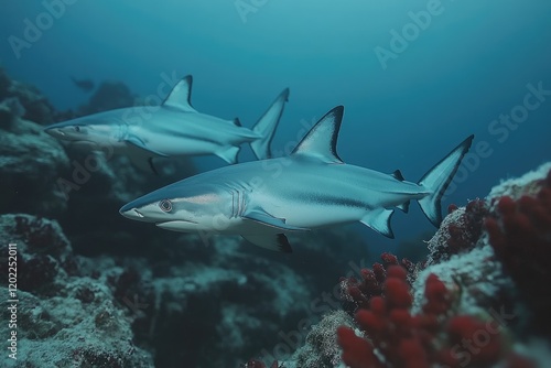 Fototapeta premium Two Grey Reef Sharks Swim Near Coral Reef