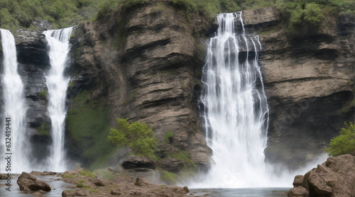 Fototapeta premium Two groups of rock formations standing at a waterfall in the mountain by Generative AI