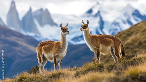 © jambulart, Obraz premium Two guanacos stand on a mountainside.