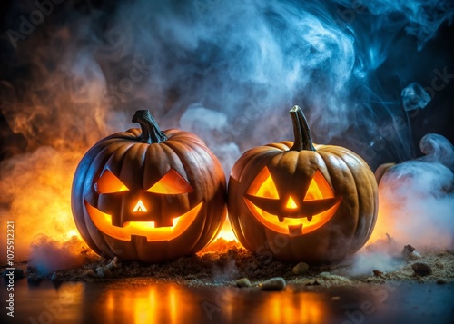 © prapatsorn, Naklejka premium Two Halloween Pumpkins with Bright Smiles Surrounded by Mist on a Dark Background, Perfect for Capturing the Spirit of the Season with a Touch of Mystery
