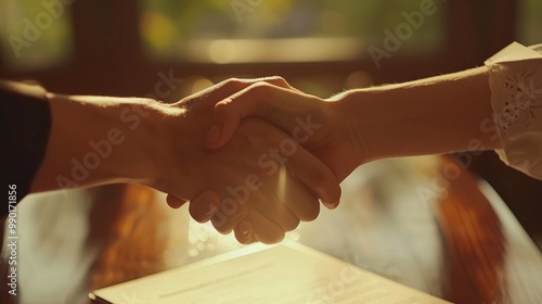 Obraz premium Two hands engaging in a handshake to signify agreement during a business meeting in a sunlit office setting