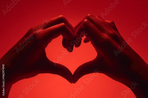 © Divine123victory, Obraz premium Two Hands Forming a Heart Shape Against a Red Background