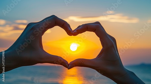 Fototapeta premium Two Hands Forming Heart Shape at Sunset or Sunrise on Beach Romantic Love and...