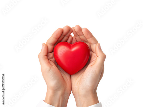 © Tanicsean, Fototapeta premium Two hands gently cradling red glossy heart in protective caring gesture showing love and support, isolated on a transparent background