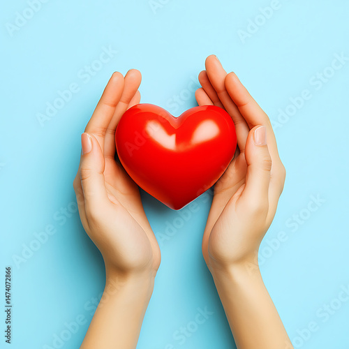 © shakir, Fototapeta premium Two Hands Gently Holding a Red Heart on a Light Blue Background