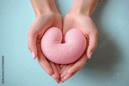 © btiger, Obraz premium Two hands gently holding a soft pink heart-shaped object against a light blue background, evoking care and tenderness
