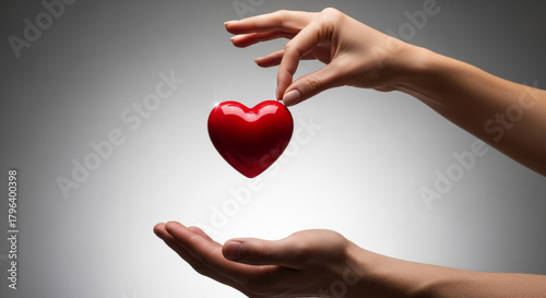 © abu, Obraz premium Two hands gently present a glossy red heart against a gradient gray background in a studio setting, symbolizing love, care, and support in a studio lighting.