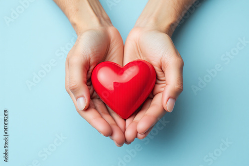 Fototapeta premium two hands holding a red heart on a blue background 1