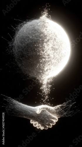 Fototapeta premium Two hands in handshake, a glowing sphere above, dissolving into particles