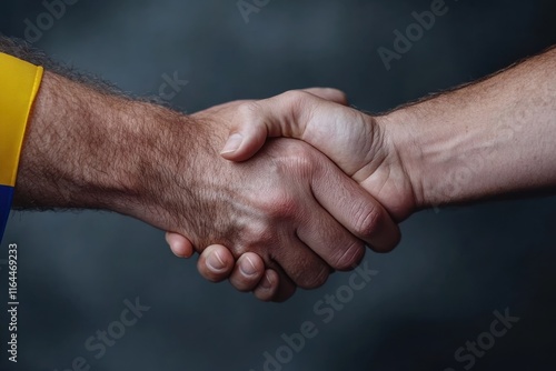 Fototapeta premium Two hands meet in a firm handshake, embodying a gesture of unity, trust, and cooperation, essential components of human interaction and relationships.