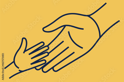 Obraz premium Two hands one large and one small reaching towards each other in a supportive gesture on a yellow background