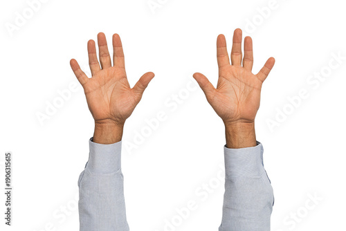 Obraz premium Two hands raised in a gesture of celebration or surrender against a white isolated background.