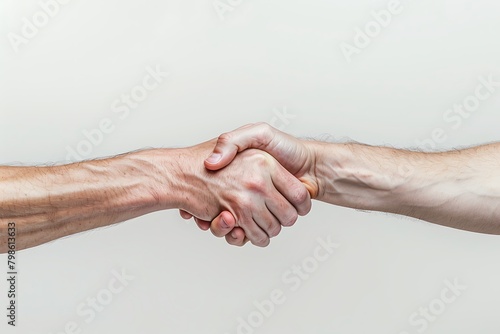 Fototapeta premium Two hands shaking, symbolizing collaboration and trust on a white background.