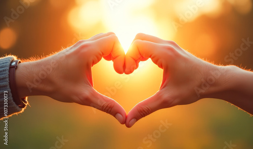 Fototapeta premium Two hands with fingers make the shape of a heart, at sunset, sunrise
