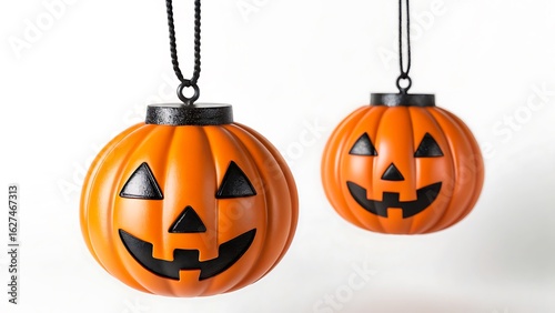 Fototapeta premium Two hanging plastic jack o lantern pumpkins with smiling faces on white background