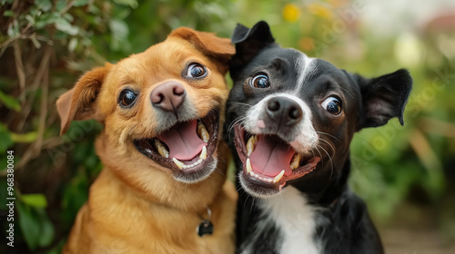 © Andres Mejia, Obraz premium Two happy dogs smiling showing teeth outdoors