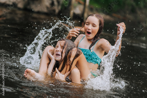 © shchus, Obraz premium Two happy girlfriends, smiling children in water playing, laughing, having fun in the lake in summer, swimming in the sea on vacation. Photography, close-up portrait, childhood concept.