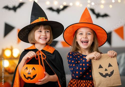 © inktrek, Fototapeta premium Two happy girls in halloween costumes with candy buckets