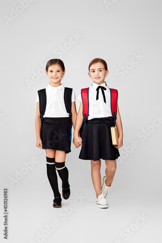 Fototapeta premium two happy little cheerful friends schoolgirls with backpacks