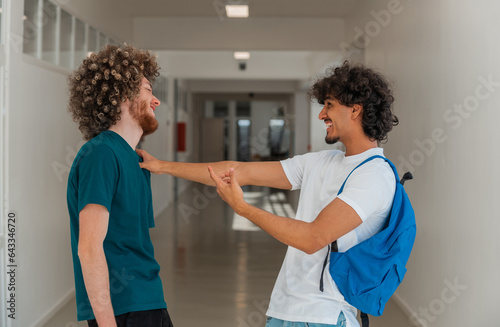 Obraz premium Two happy male college students having fun while talking with each other on a...