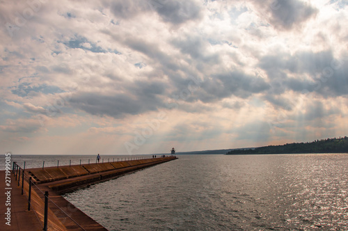 Obraz premium Two Harbors Breakwall and navigation light in Agate Bay of Lake Superior with dramatic light through the clouds