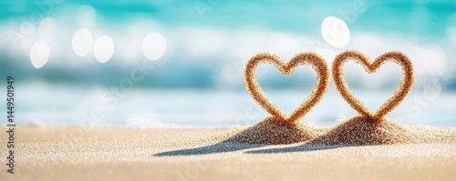 © Mnt, Naklejka premium Two heart shapes made of sand on a beach, symbolizing love and tranquility.