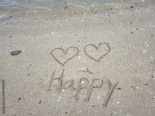 © Mumumutelu , Fototapeta premium Two hearts drawn on sand beach