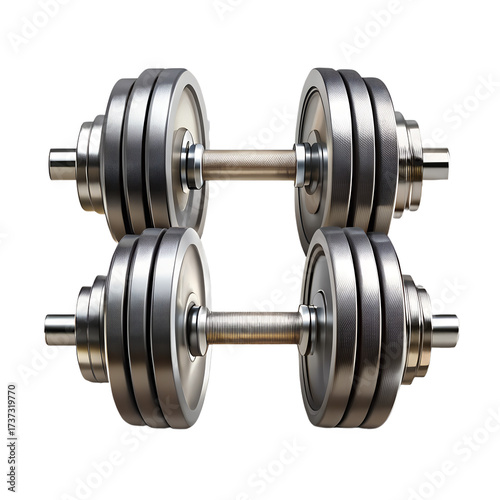 Naklejka premium Two heavy metal dumbbells with weight plates, isolated on a transparent background, representing fitness and exercise