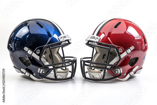 © Midea , Fototapeta premium Two helmets on a white background: one black with a visor, one white with a logo, side by side.