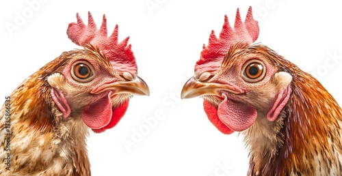 Naklejka premium Two hens face each other in profile view