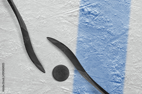 Fototapeta premium Two hockey sticks, a puck and a fragment of the ice arena with a blue line