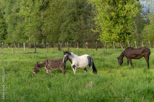 © bios48, Fototapeta premium Two horses and a donkey in a pasture in spring.