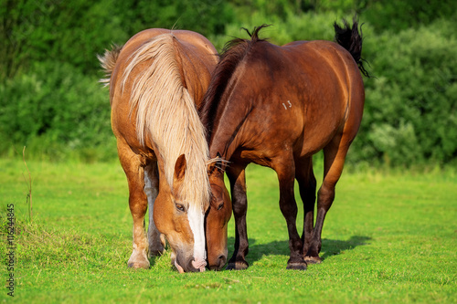 © julia_siomuha, Fototapeta premium Two horses eating grass together