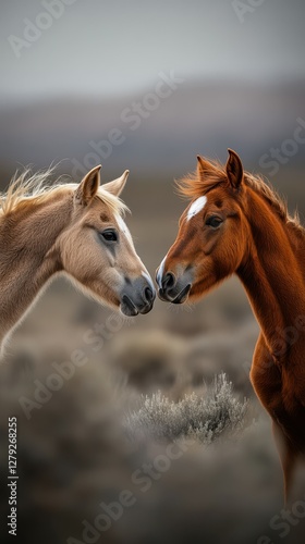 © Georg, Fototapeta premium Two horses gently touching noses in a serene landscape at dusk