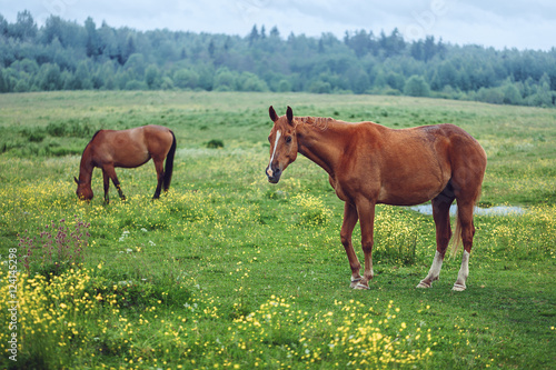 © mikelaptev, Fototapeta premium Two horses grazing in field