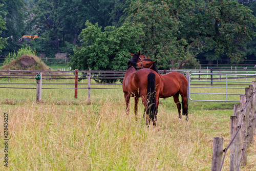 © Dennis Gross, Fototapeta premium Two horses in a meadow embracing in friendship