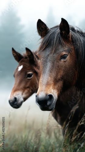 © Georg, Naklejka premium Two horses in a misty field at dawn under soft morning light showcasing their calm demeanor and natural beauty