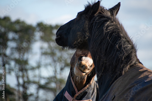 Fototapeta premium Two Horses in paddock greeting and biting each other