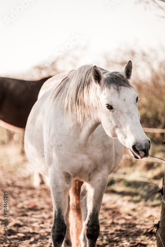 © PIC by Femke, Fototapeta premium two horses playing in beautiful morning winter sun in paddock paradise equine habitat system