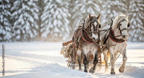 Naklejka premium Two horses pulling a sleigh through snowy forest in winter