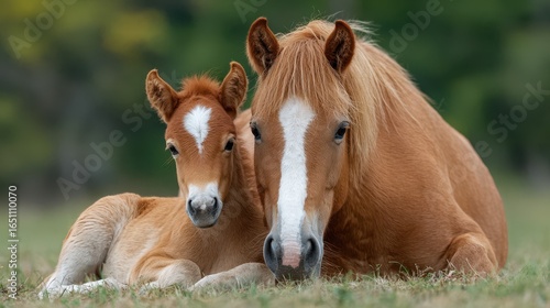 © Michael, Obraz premium Two horses resting together in a peaceful meadow on a sunny day in spring