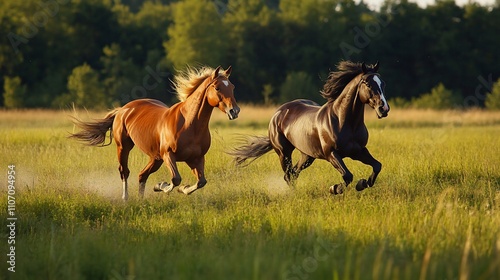 Fototapeta premium Two horses running freely in a green field with a forest in the background.