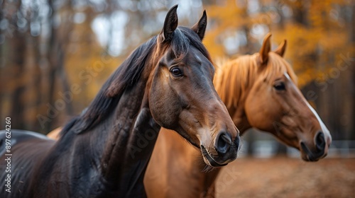 © Blackmint Studio, Fototapeta premium Two horses stand side by side in a forest, with a backdrop of fall foliage