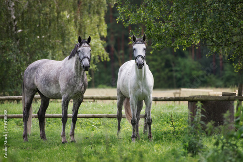 © otsphoto, Naklejka premium two horses standing on a field