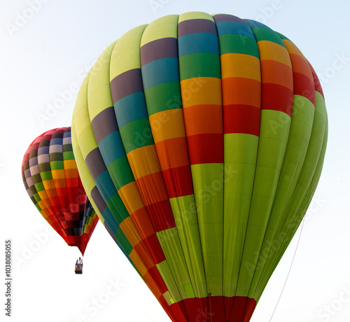 © schankz, Obraz premium Two hot air balloons are floating in the sky, one of which is green