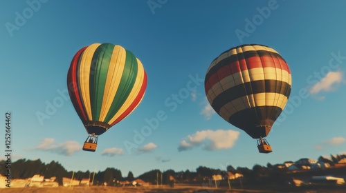 Fototapeta premium Two hot air balloons fly over rural landscape at sunset