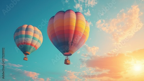 © novitasary, Fototapeta premium Two Hot Air Balloons Soaring at Sunset