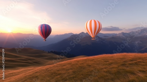 © darion, Fototapeta premium Two hot air balloons soaring over a scenic mountain landscape at sunset.
