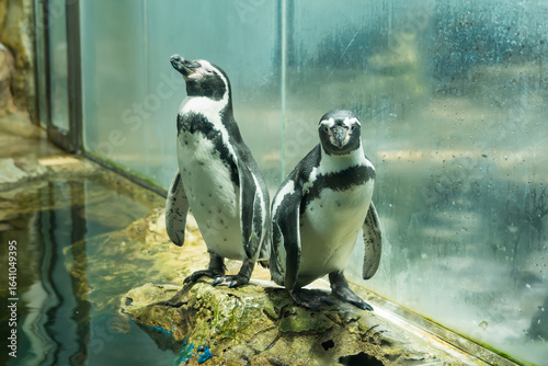 Naklejka premium Two Humboldt penguins standing in front of an aquarium glass enclosure, with...
