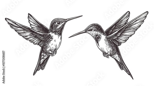 Fototapeta premium Two Hummingbirds Flying in the Air on a White Background, Scratch Board...